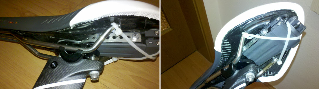 Wichtigstes Werkzeug für die Durchführung der Bastelarbeiten waren ein scharfes Stemmeisen und ein Hammer (ganz im Ernst!). Damit konnte ich auf der Sattelunterseite noch etwas Platz für den Akku machen (das Fizik Logo musste weichen). Für die Befestigung habe ich aus einem Lochblech eine kleine Halterung gebaut, mit der der Akku in der Sattelklemmung verschraubt wird. Damit nichts wackelt, wird der Akku noch zusätzlich mit zwei Kabelbindern befestigt. Verbesserungspotential gibt es natürlich auch noch: anstatt der weißen Kabelbinder müssen da noch schwarze hin, aber die hatte ich in der passenden Länge gerade nicht vorrätig.